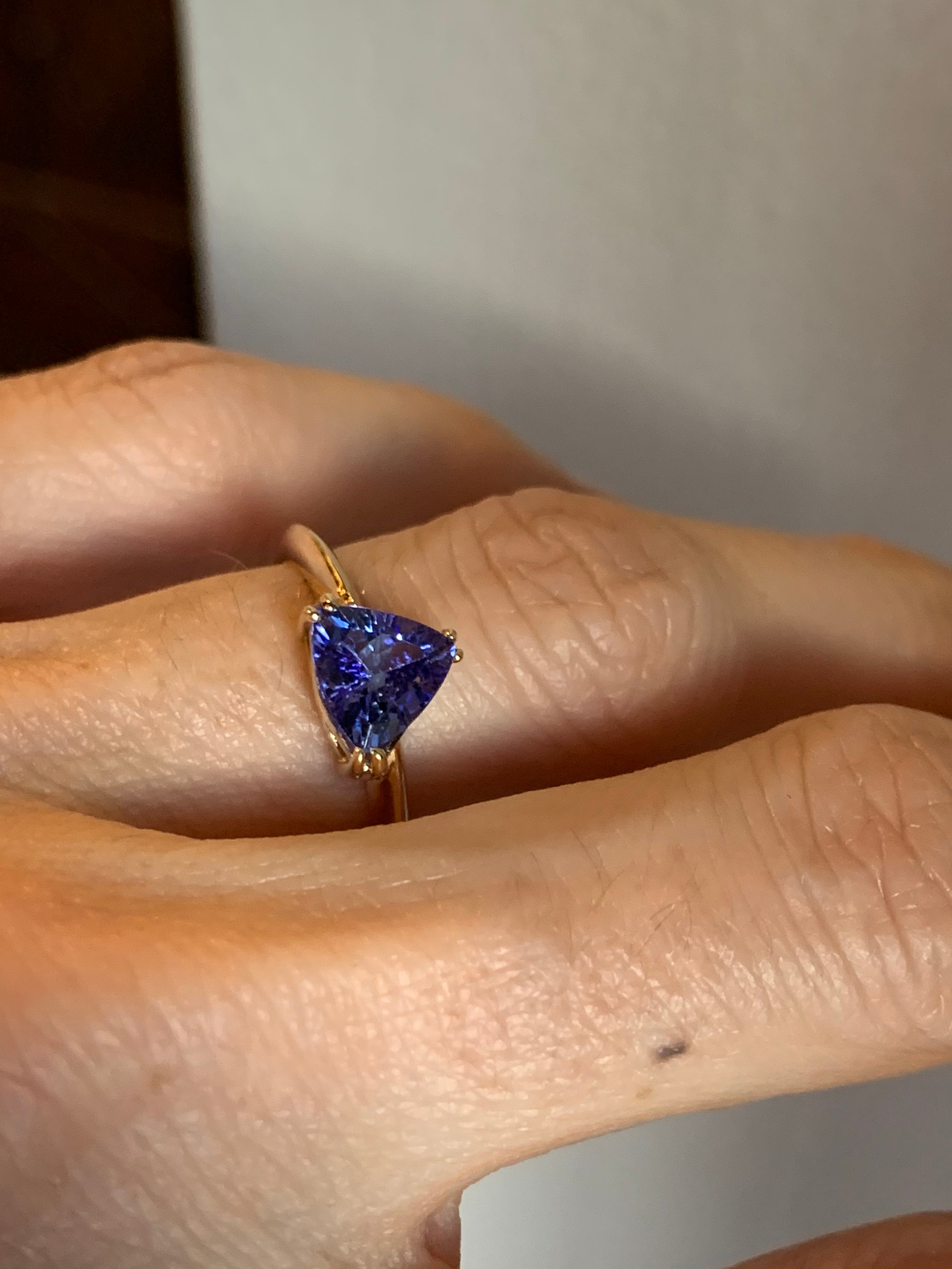 1.5 Carat Pyramid Tanzanite Ring set in a solid 14K 3 prong basket setting.
