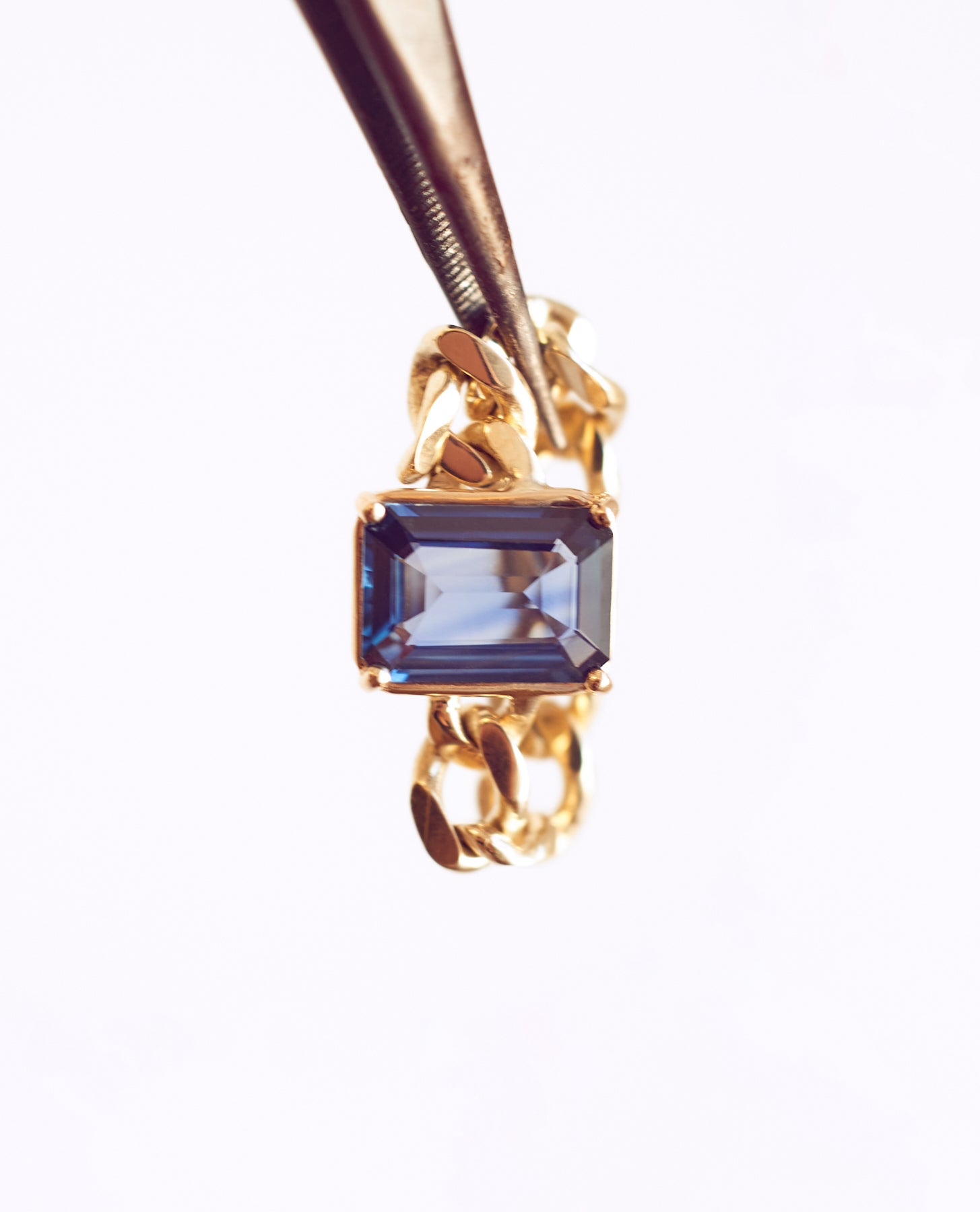 This stunning 14 x 10mm blue sapphire features an emerald-cut, and is set in a 14K yellow gold wire basket. The 6mm solid gold cuban chain-link ring shank feels luxurious.