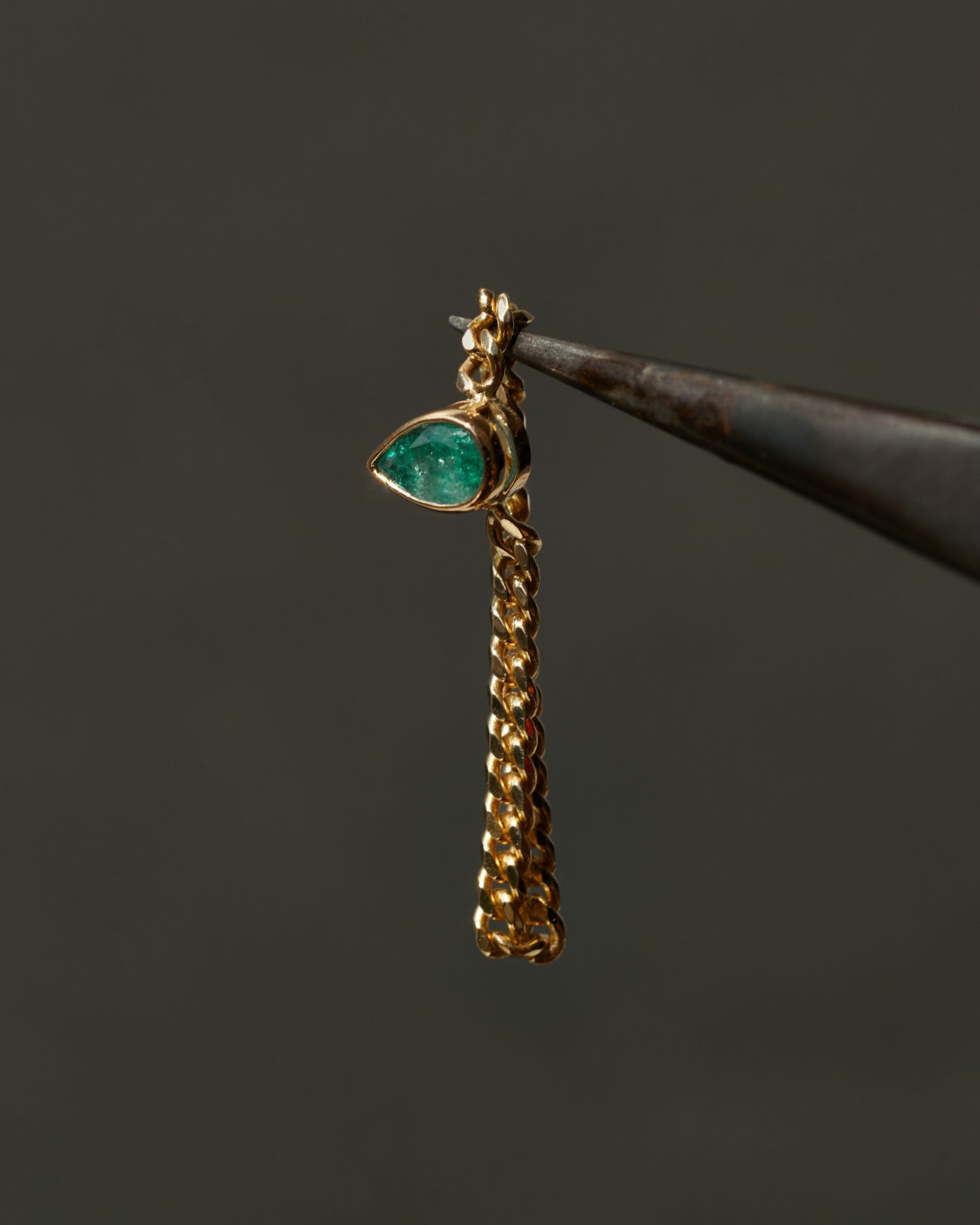 The strongest link. Our brilliant emerald tear drop ring measures at 4mm x 3mm. Hand set in our 14k yellow-gold bezel setting on a 2.4mm 14k yellow-gold cuban-link chain.