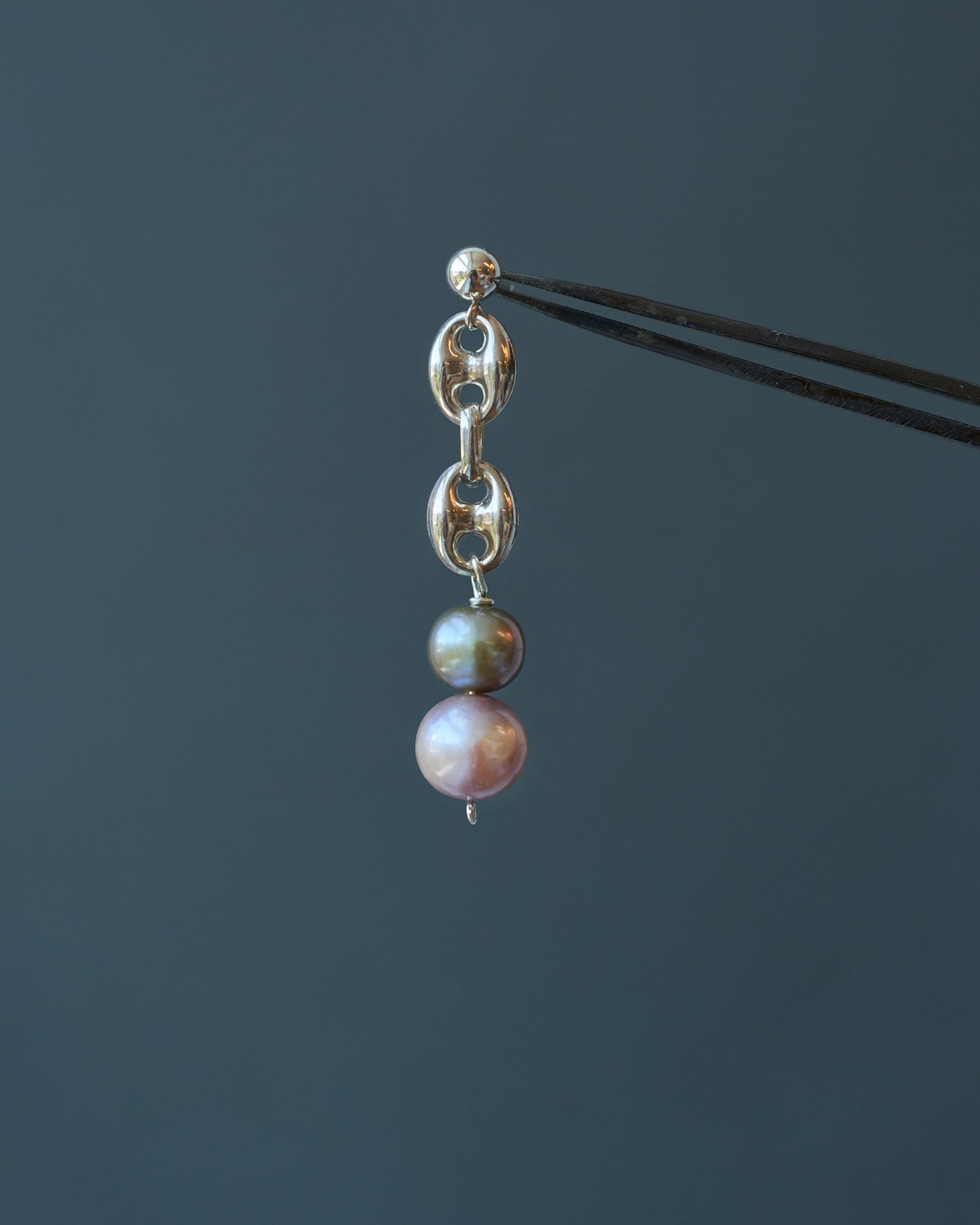 This Gucci-style two-link chain is deliciously paired with a combination of grey and pink 7-8mm pearls to create a unique pear-shaped dangle earring that suspends from a 6mm silver ball. Listing is for a single earring.