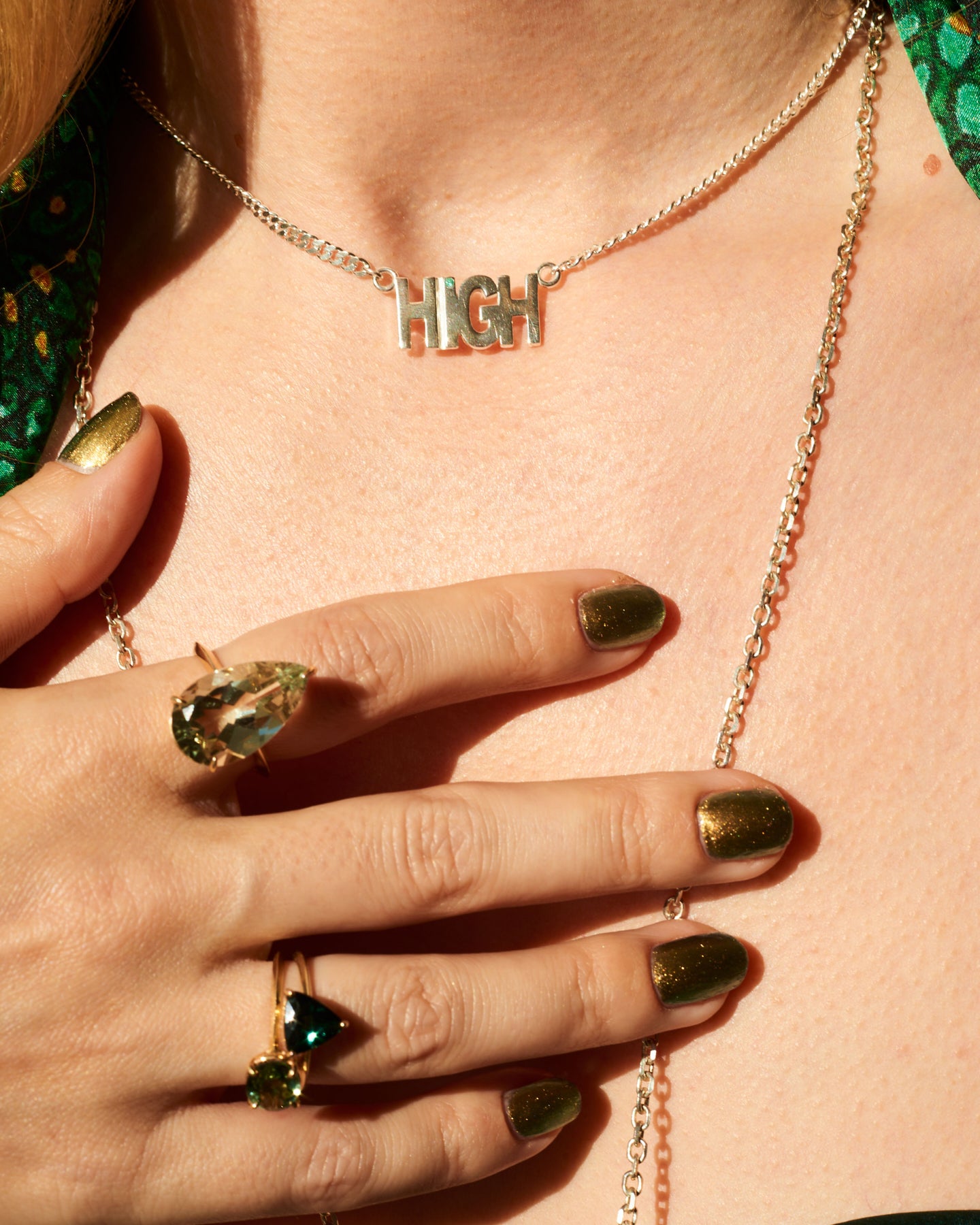 Our handmade HIGH necklace features a 1mm round-cut emerald on the letter "I". All four letters measure 3/8" in height with a 15" chain length. Available in 14K yellow gold, 14K rose gold, or sterling silver.
