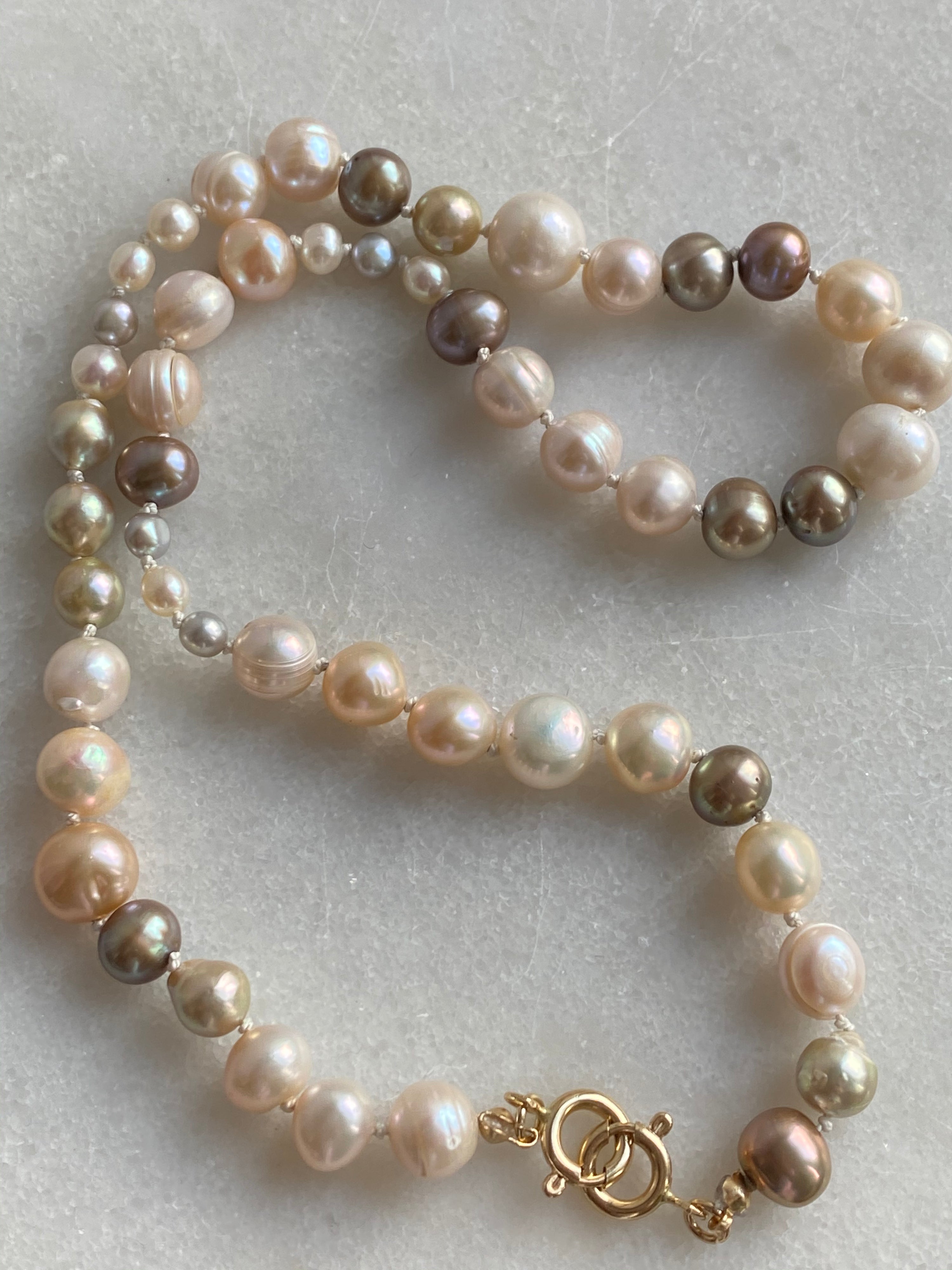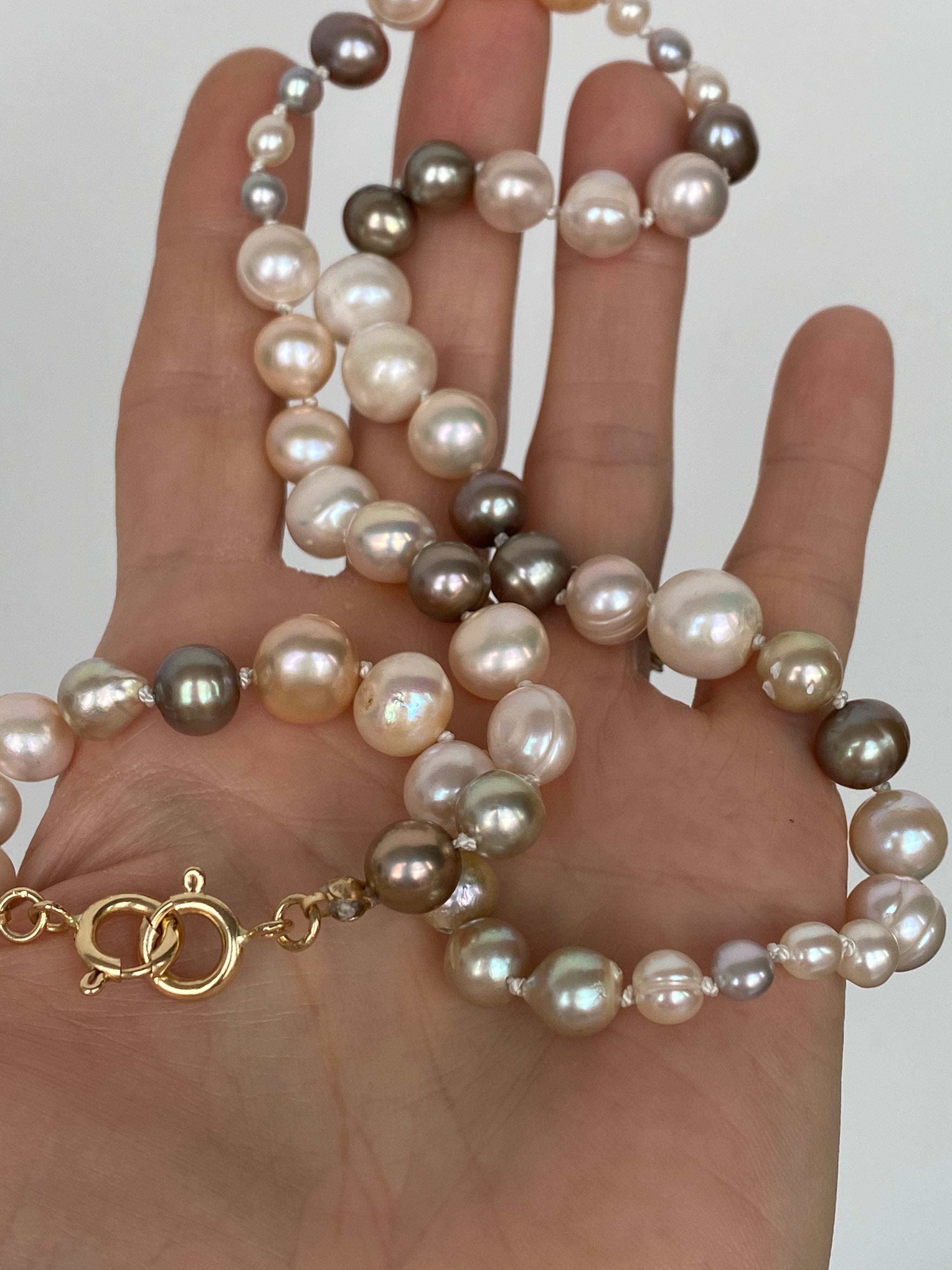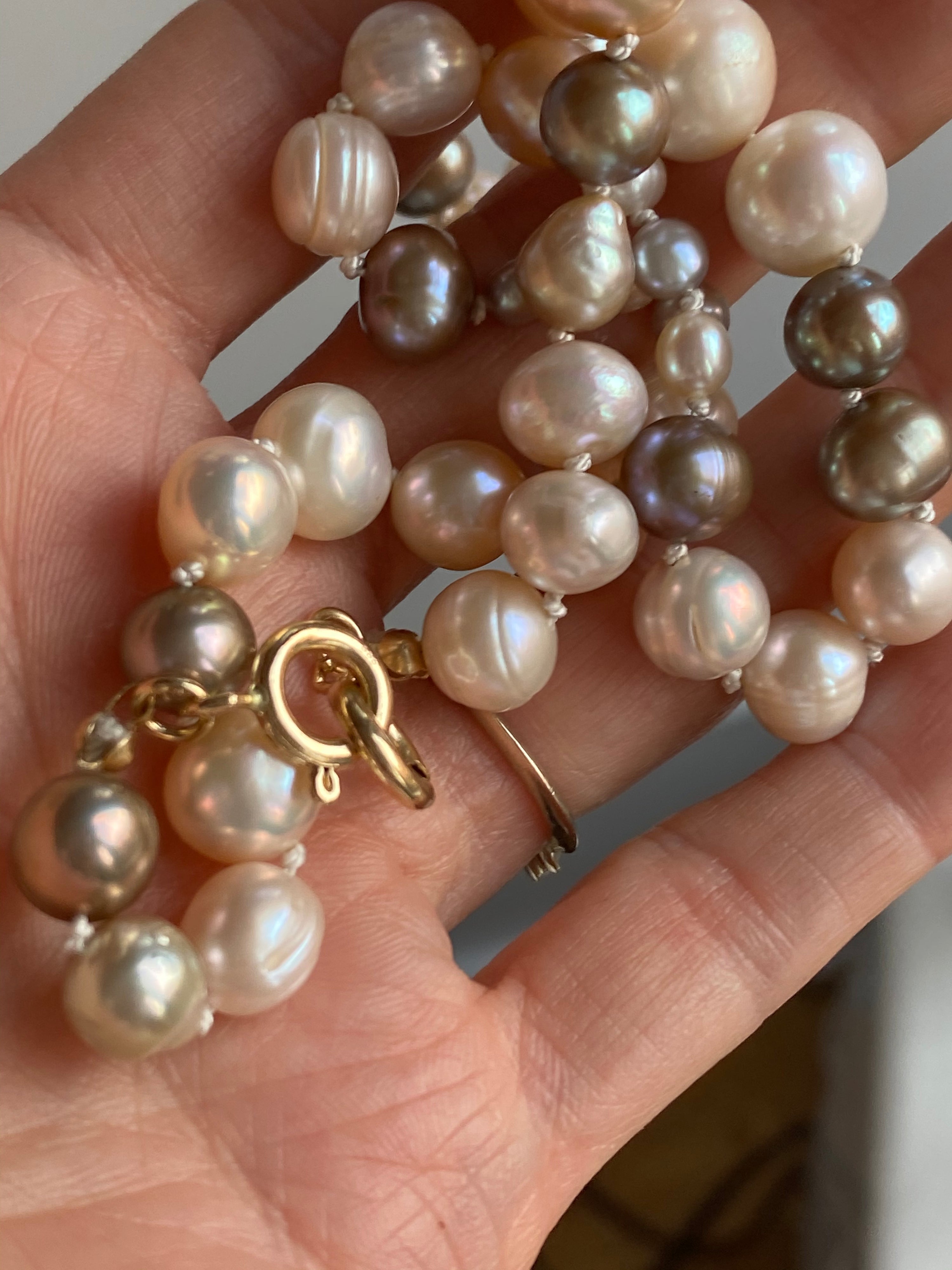 Hand strung natural colored round pearls with cream, silver, pink and gold tones. Pearl gauge varies from 6mm - 12mm. 14K Gold closures are beautiful hardware