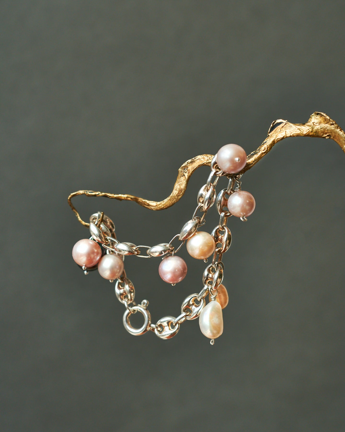Unique chain bracelet featuring six 8mm pink pearls flanked by a single baroque green pearl and white pearl. Eclectic and regal.