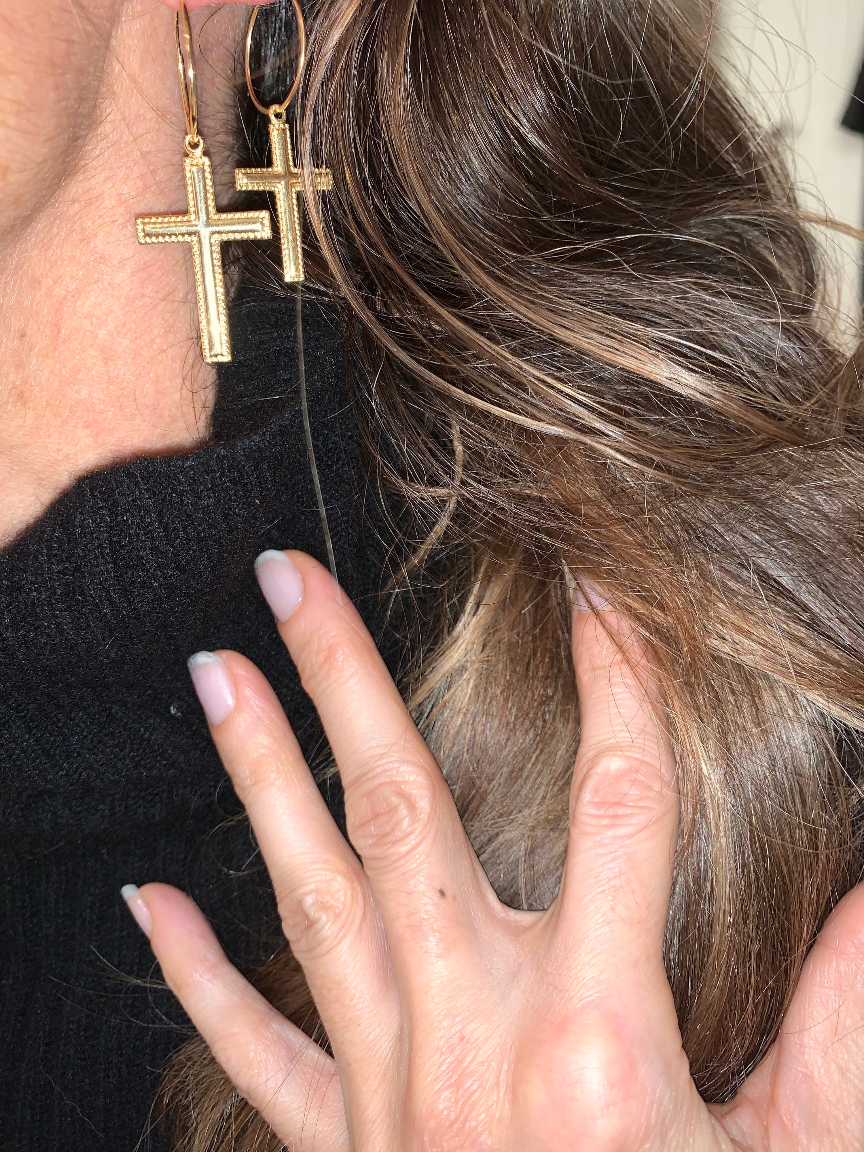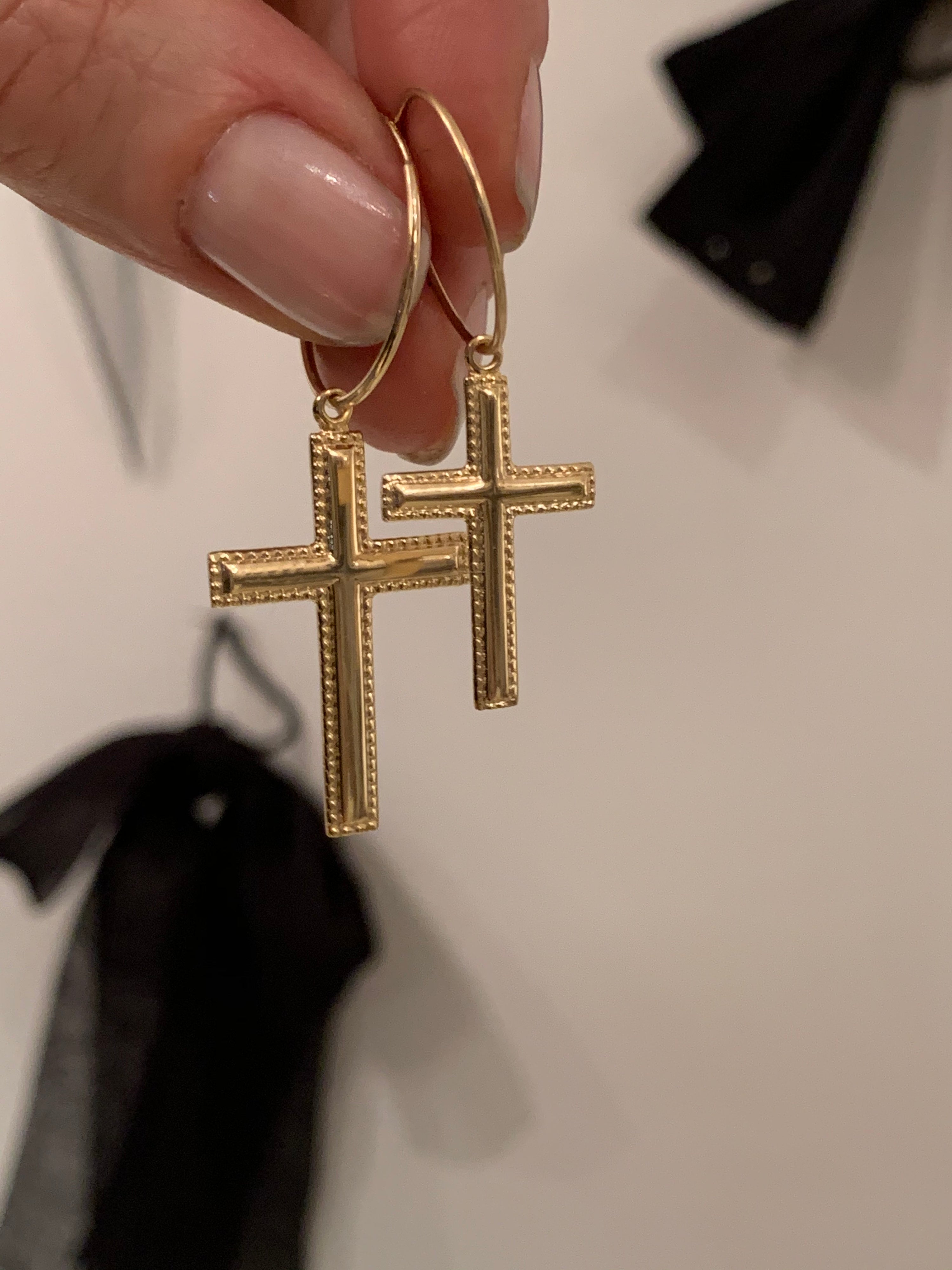 Small 14k solid gold perles edge cross on 24mm 14k hard wire hoop.