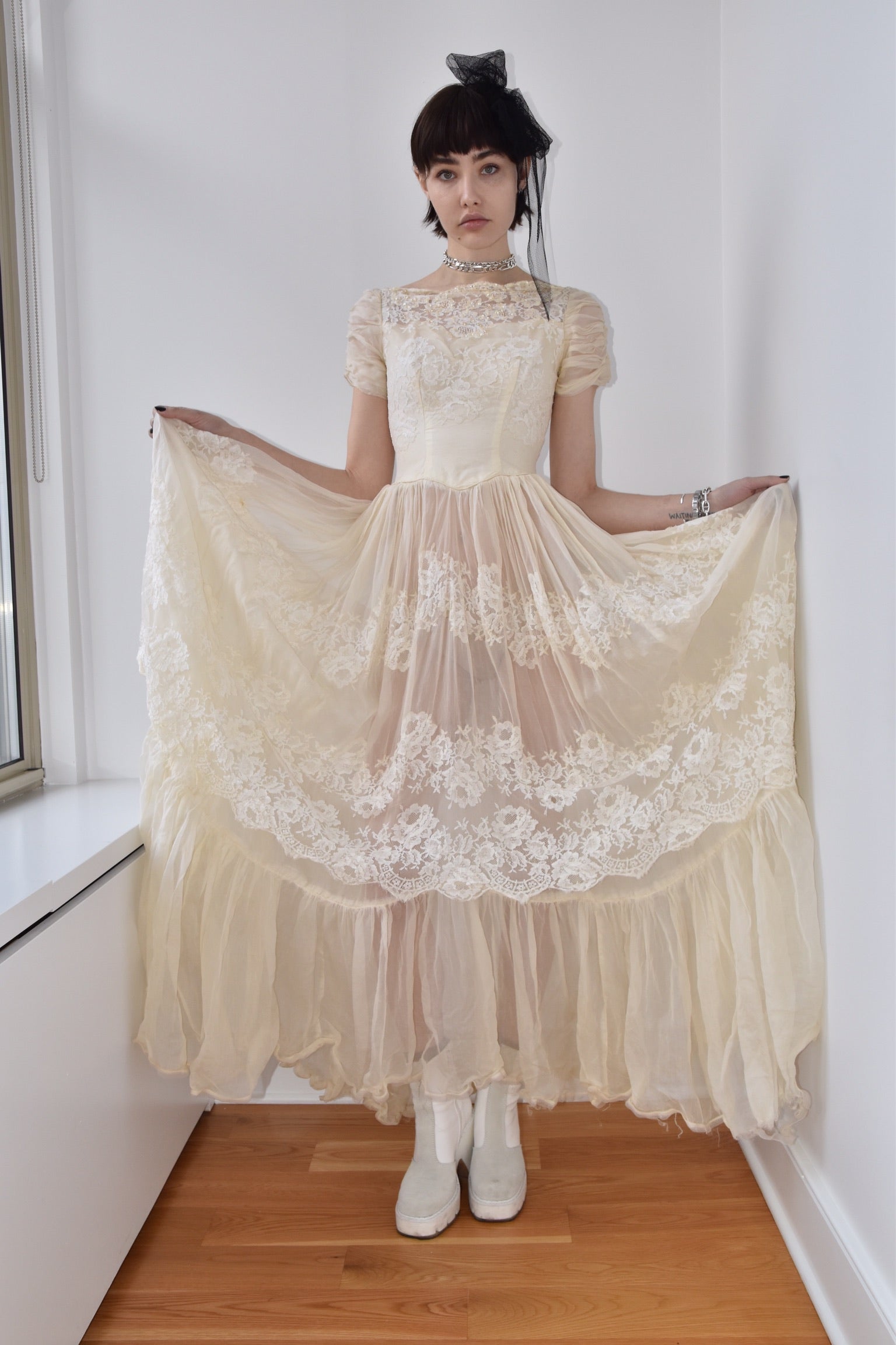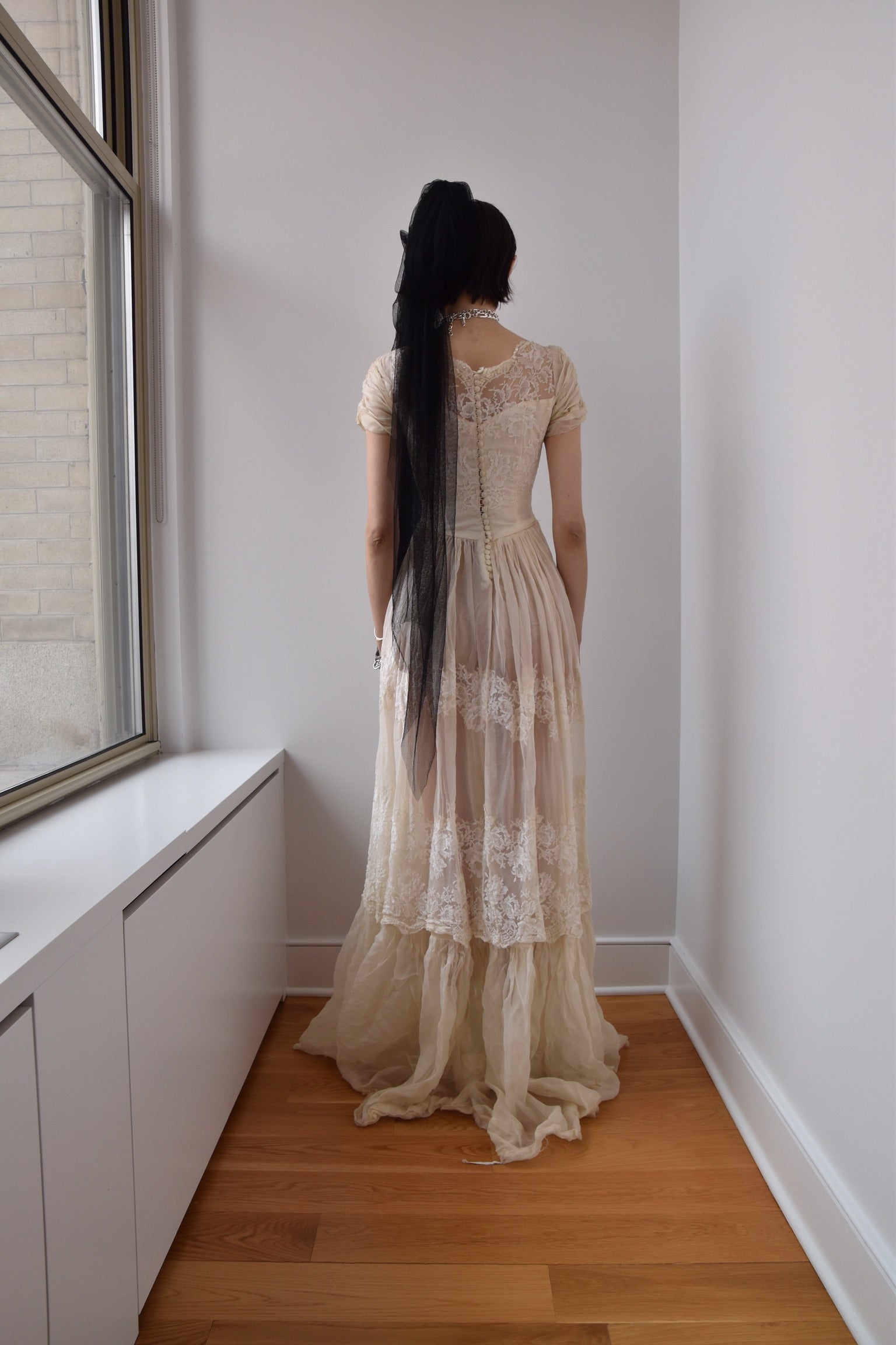 Vintage French Silk Lace Overlay Gown with Pearl Embroidery